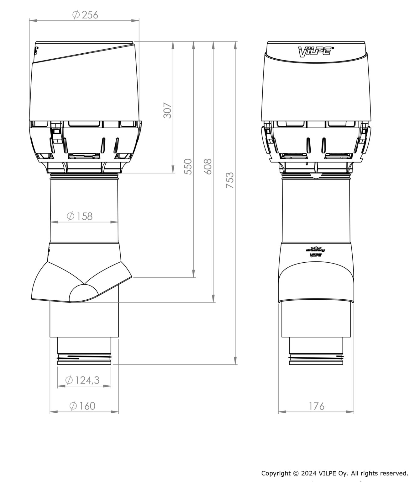 Ø воздуховода 125 мм, внешний Ø 160 мм, высота 500 мм.