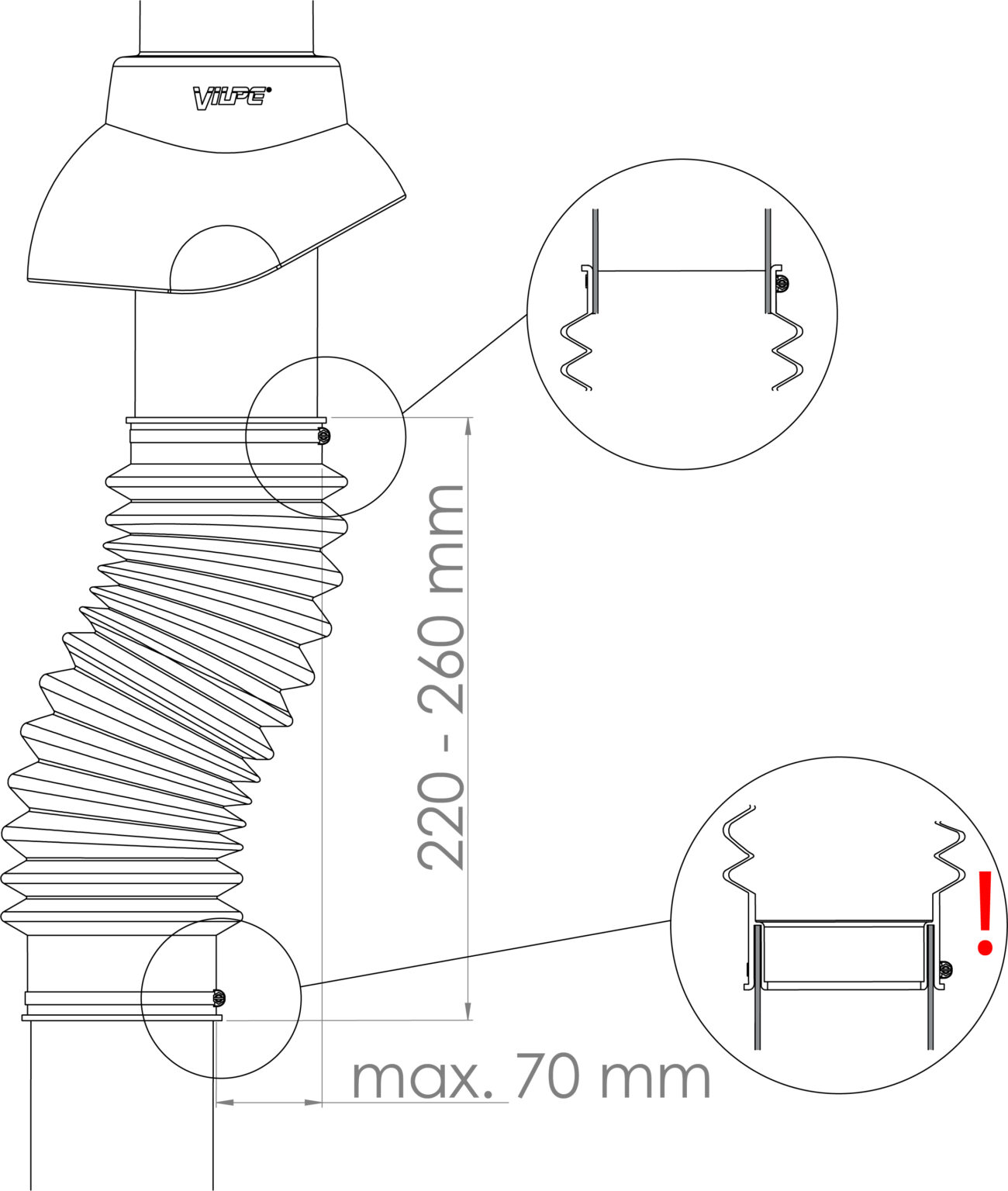 Монтаж: верхняя часть гофрированной трубы крепится металлическим хомутом к вентиляционному выходу, складка нижней части гофрированной трубы насаживается на канализационный стояк и крепится металлическим хомутом.