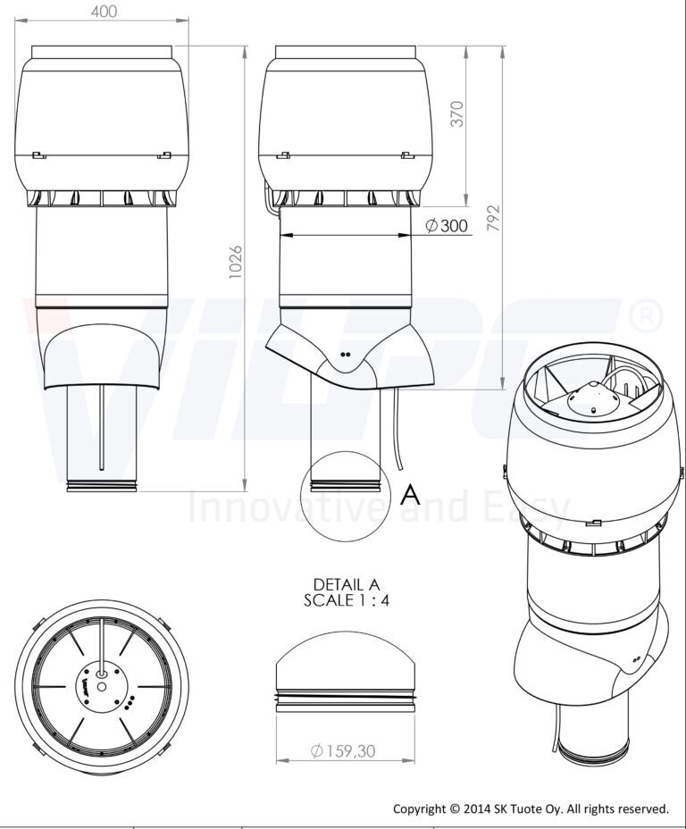 XL -E220Р/160/700 вентилятор представляет собой трубу с колпаком, в который встроен вентилятор. Труба теплоизолирована для предотвращения образования конденсата в трубе. Внутренняя труба изготовлена из оцинкованной стали и имеет теплоизоляцию толщиной 50 мм. Длина внутренней трубы позволяет вставить ее в подводимый воздуховод на длину 300 мм. Это облегчает вертикальный монтаж в тесных чердачных помещениях и одновременно делает конструкцию более прочной. Нижний край внутренней трубы имеет резиновый уплотнитель, герметизирующий соединение трубы и воздуховода.