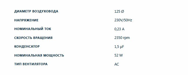 0 -400 м3/ч. Тип двигателя AC. Диаметр воздуховода 125 мм.