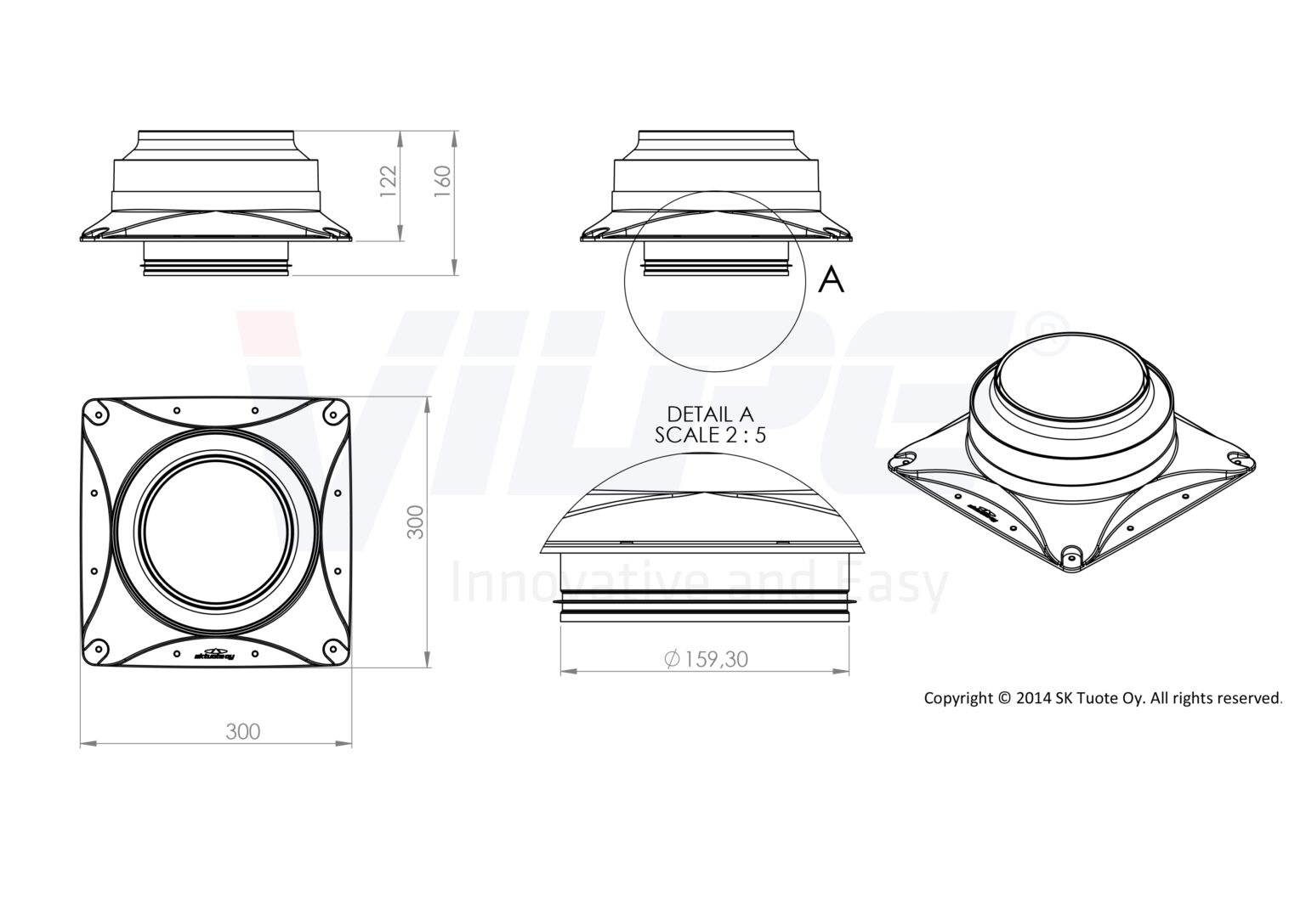 Комплект: E220S вентилятор, основание 300 х 300 мм с соединительным патрубком, 2 монтажные инструкции и 2 набора крепежа.