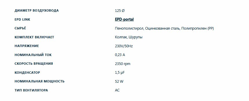 Воздушный поток 0 -500 м3/ч. Диаметр воздуховода 125 мм. Тип двигателя AC.