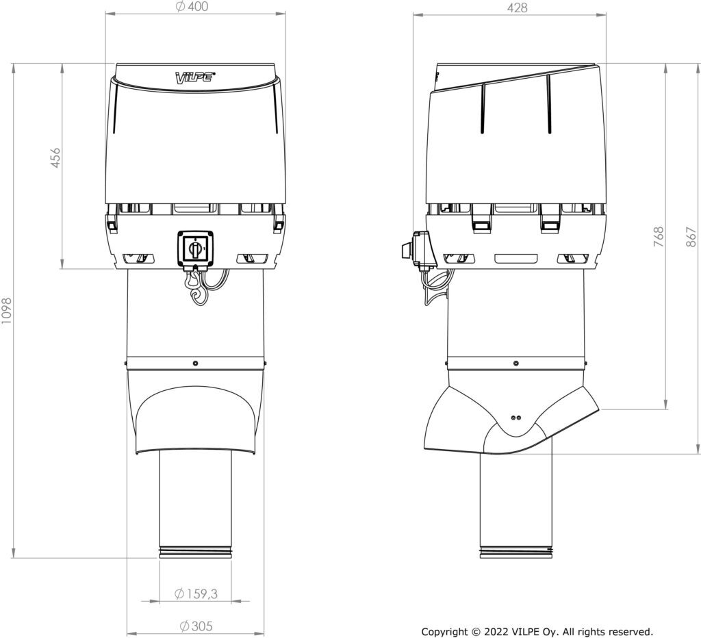 Ø воздуховода 160 мм, внешний Ø 305 мм, высота над кровлей прибл. 700 мм.