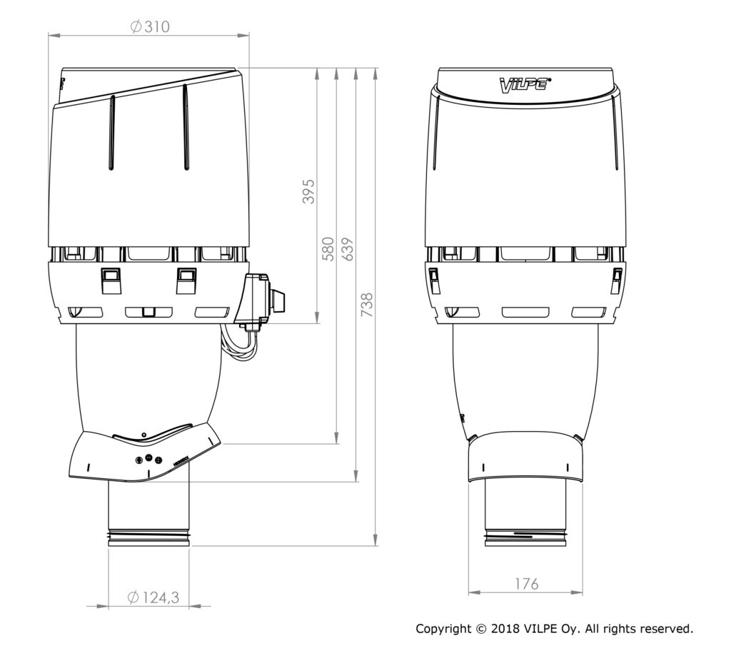 Ø воздуховода 125 мм, внешний Ø 225 мм, высота над кровлей прибл. 500 мм.