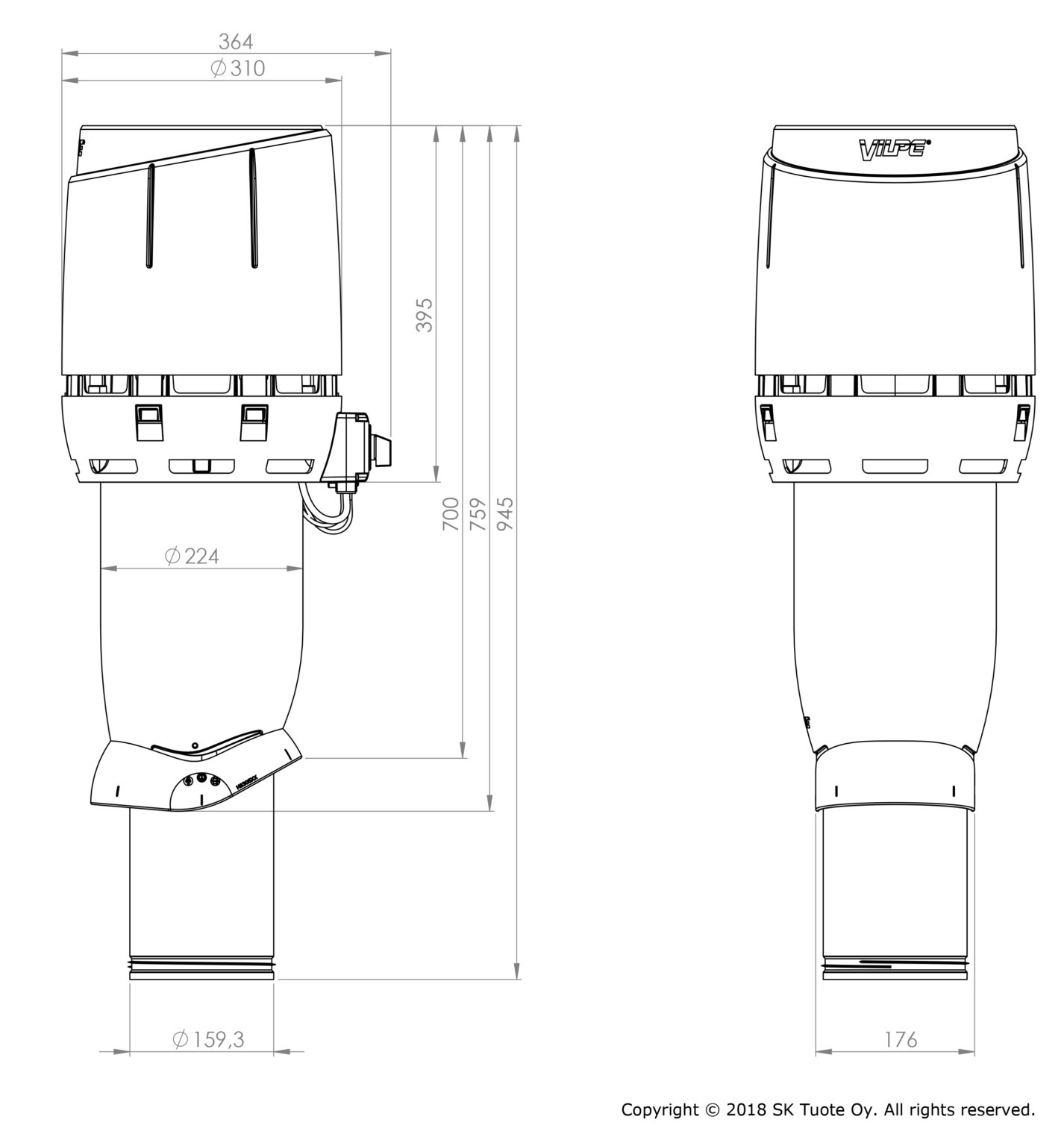 Ø воздуховода 160 мм, внешний Ø 225 мм, высота над кровлей прибл. 700 мм.