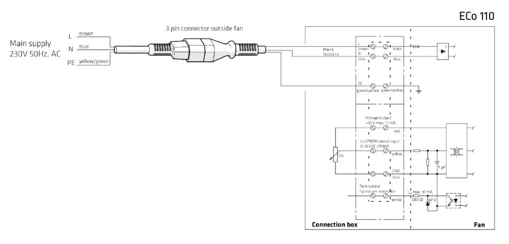 Вентилятор имеет встроенный блок регулировки с заводской настройкой на 3 В, но при необходимости регулировку можно изменить до 10 В. Регулятор скорости не ставится.