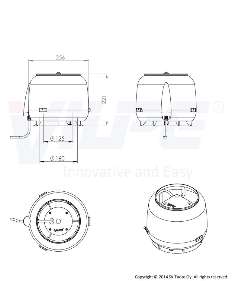 Совместим с изолированной трубой VILPE 110 мм или с другой трубой с наружным диаметром 160 мм. Основание для монтажа на плоскую поверхность входит в комплект, при установке на вентиляционную шахту, периметр шахты должен быть не меньше размера основания.