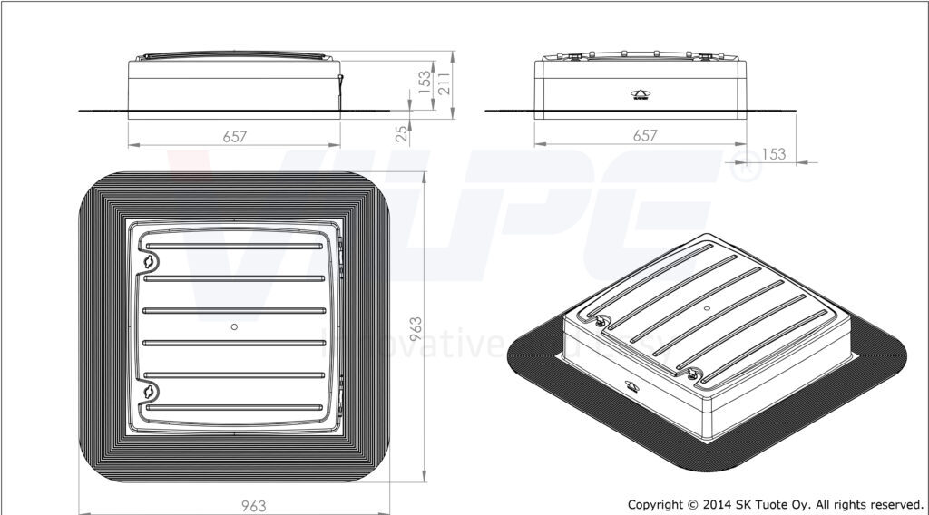 Размеры: отверстие 657х657 мм, общий размер 963х963х211 мм.