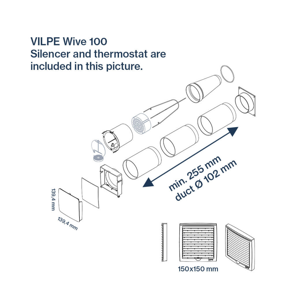 Комплект: VILPE WIVE 100 приточный клапан с термостатом, фильтр класса M5, шайба-шумопоглотитель, наружный козырек, набор крепежа и монтажная инструкция. Набор сменных фильтров приобретается отдельно.