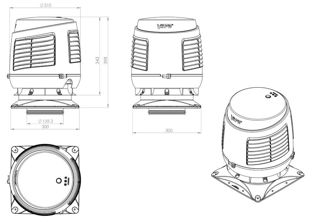 Размеры: диаметр воздуховода 160 мм, размер основания 300х300 мм.