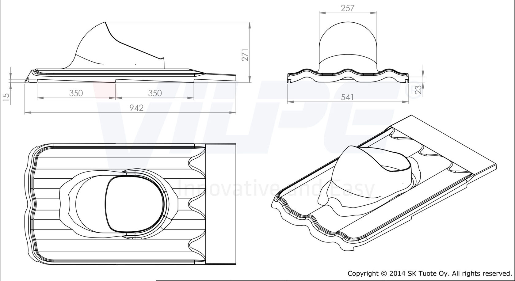 ХЛ-МУОТОКАТЕ (XL-MUOTOKATE) проходной элемент для монтажа на металлических кровлях с профилем Monterrey (ширина волны ≈ 183,3 мм, длина профиля min 350 мм, высота профиля ≈ 39 мм) труб и вентиляторов диаметром 160 –250 мм и XL -резинового ворота.
