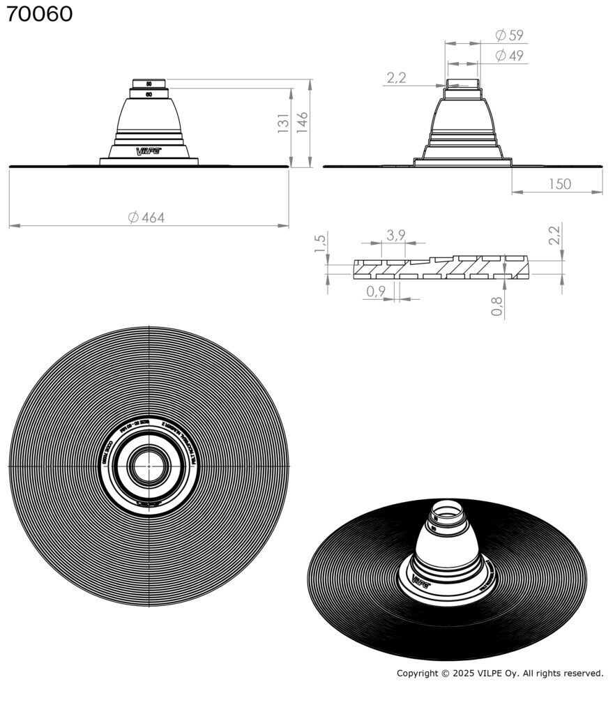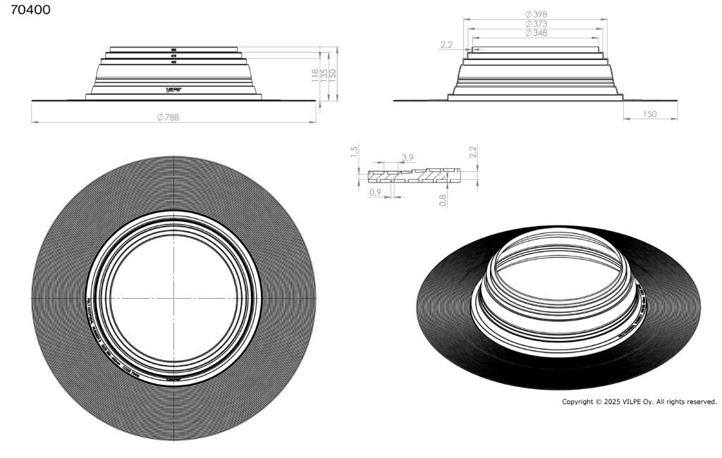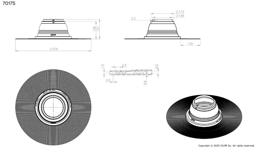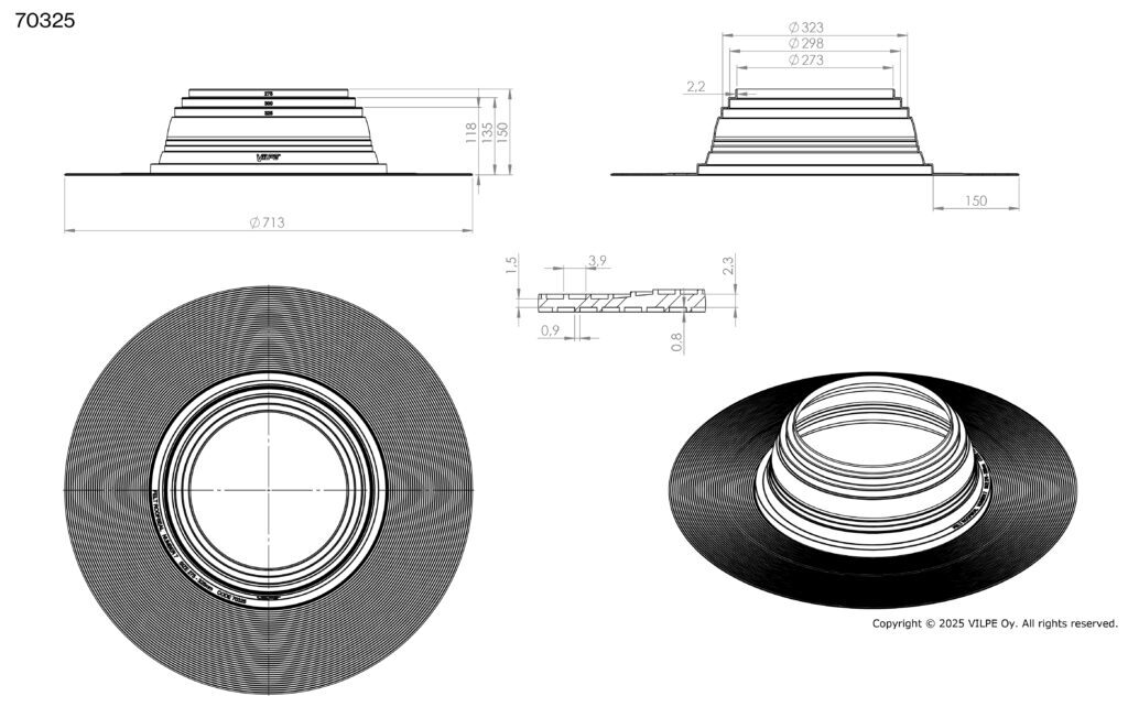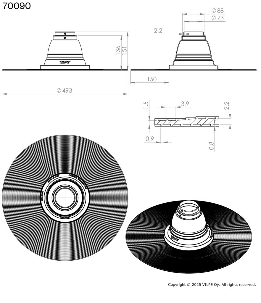 Запатентованное рифление и специальная обработка фланца обеспечивают надежное соединение с битумным материалом и максимально большую площадь поверхности уплотнения. Ширина фланца 150 мм соответствует Европейским строительным нормам. Комплектуются металлическими хомутами.